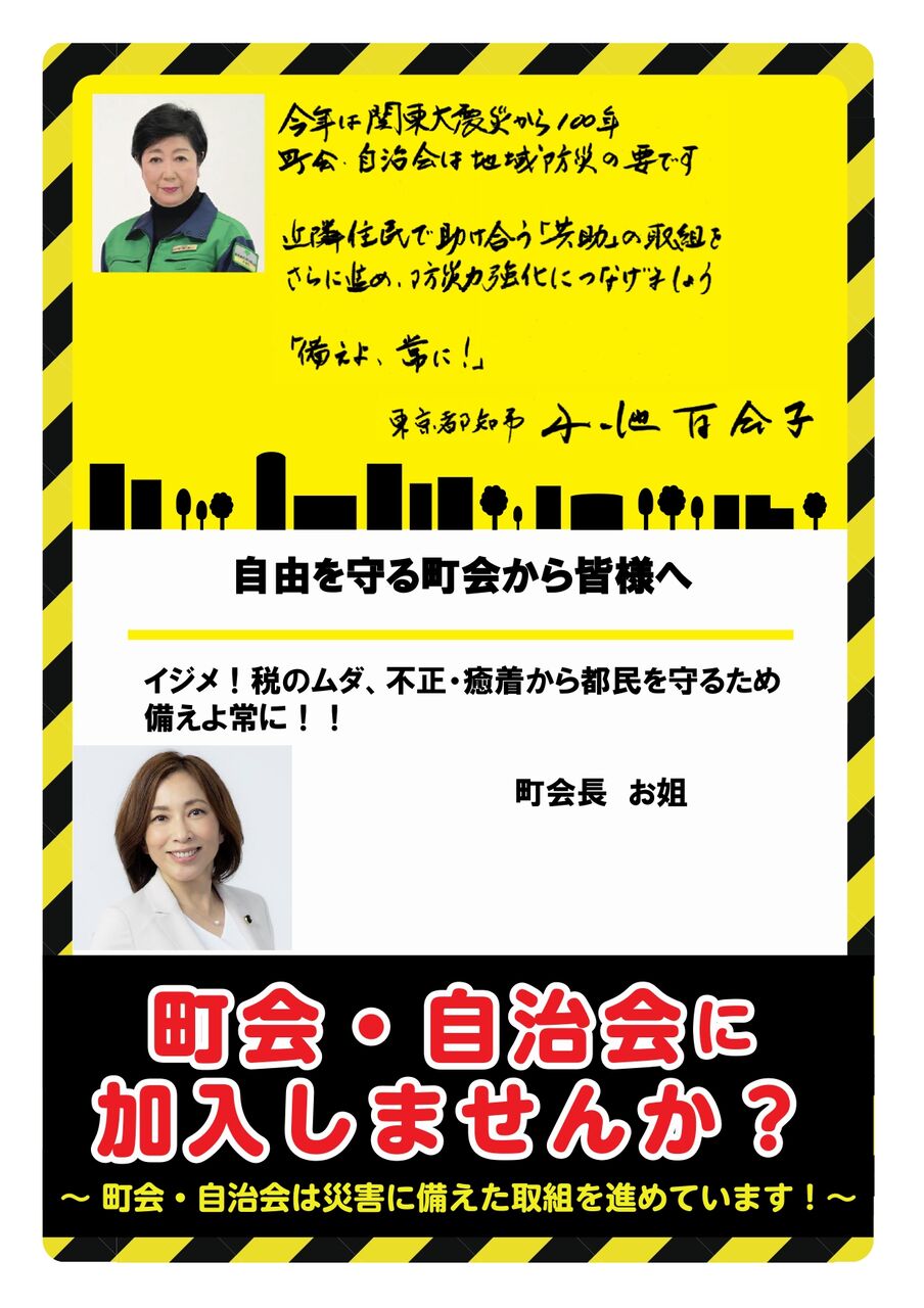 「関東大震災100年町会・自治会防災力強化助成」事業について、「助成条件として、町会・自治会からのメッセージ等を記載した、町会の防災対策や加入促進に係るチラシの掲示板への掲示を必ず実施してください。」というトンデモない条件が付いたのであります。