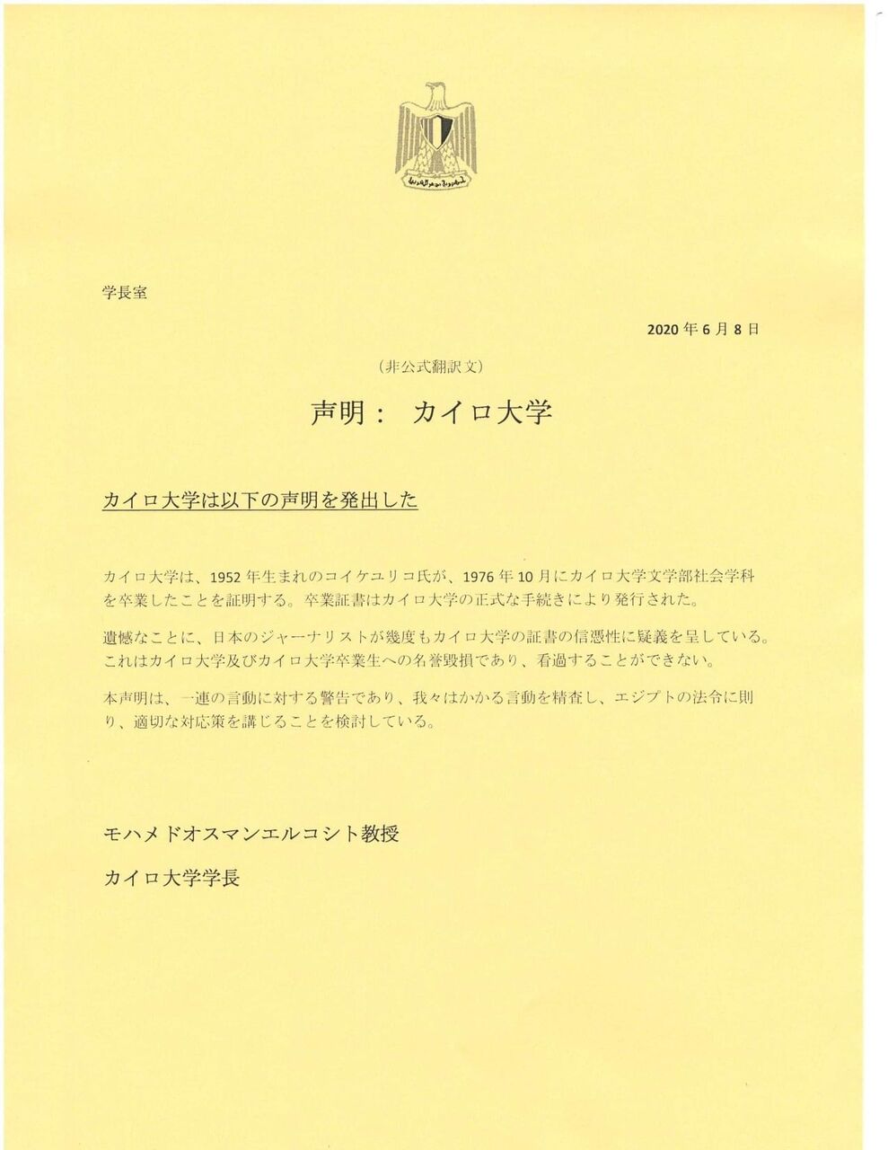 小池知事が学歴詐称疑惑から首尾よく逃げるために「声明文」を在日エジプト大使館FACEBOOKへ公表させることに成功した喜びが文書にもにじみ出ています。