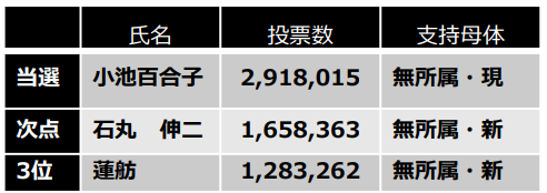令和6年7月7日東京都知事選挙が執行され、過去最多50人超の候補者が乱立する中小池百合子氏が三期再選という結果となりました。