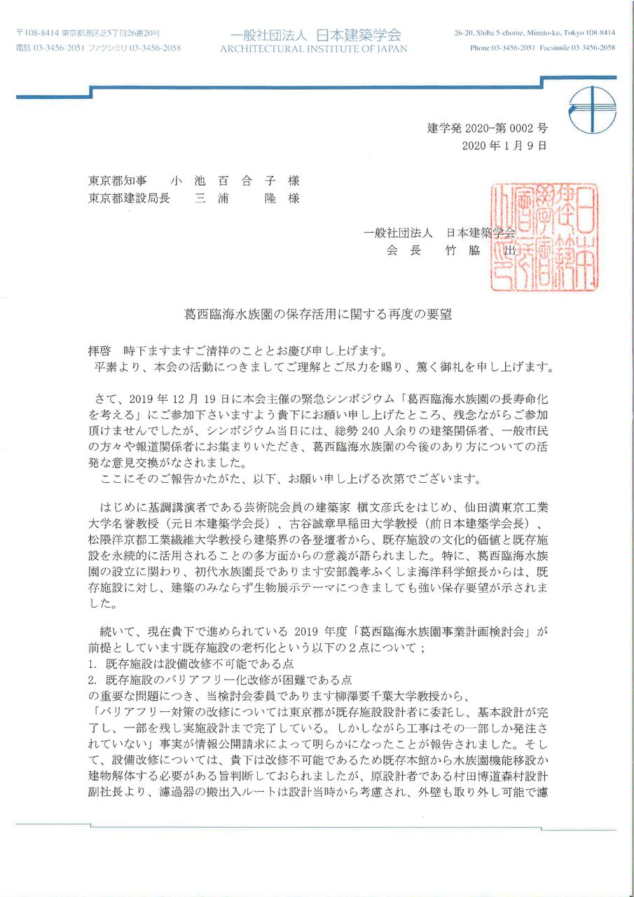貴下におかれましては、この建物の有する文化的価値とシンポジウムで既存施設の維持存続が十分可能であることが明らかとなった事実を深くご理解いただき、既存施設の水族館機能を保持した上で、保存・活用を考慮した適切な葛西臨海水族園の長寿命化計画の立案と改修計画の策定を再度ご検討下さいますよう、ここに強くお願い申し上げる次第です。
