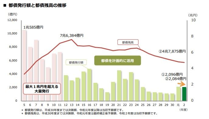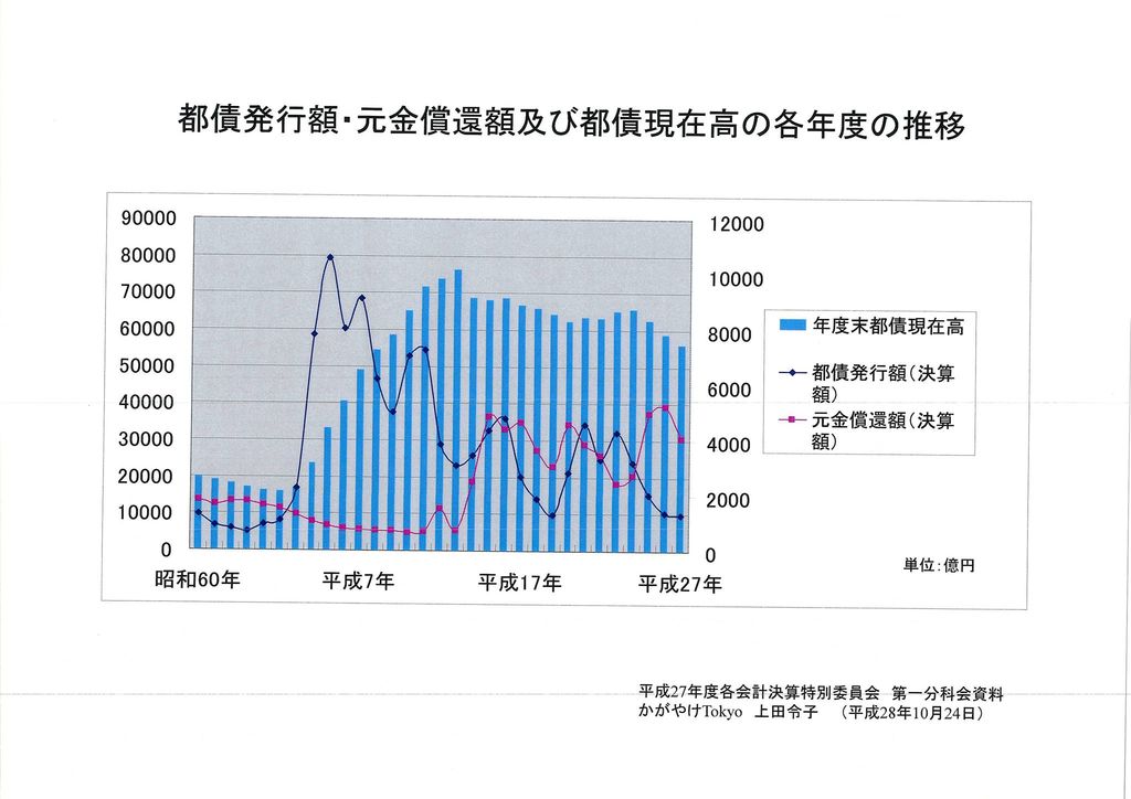 都債残高(借金残高)は圧縮傾向にあるとはいえ、利息含めた都民の将来負担を鑑みれば、巨額の財政需要の前にさっさと、借金(都債残高)は返して新たな借金(起債)はしない、これに限ります。
