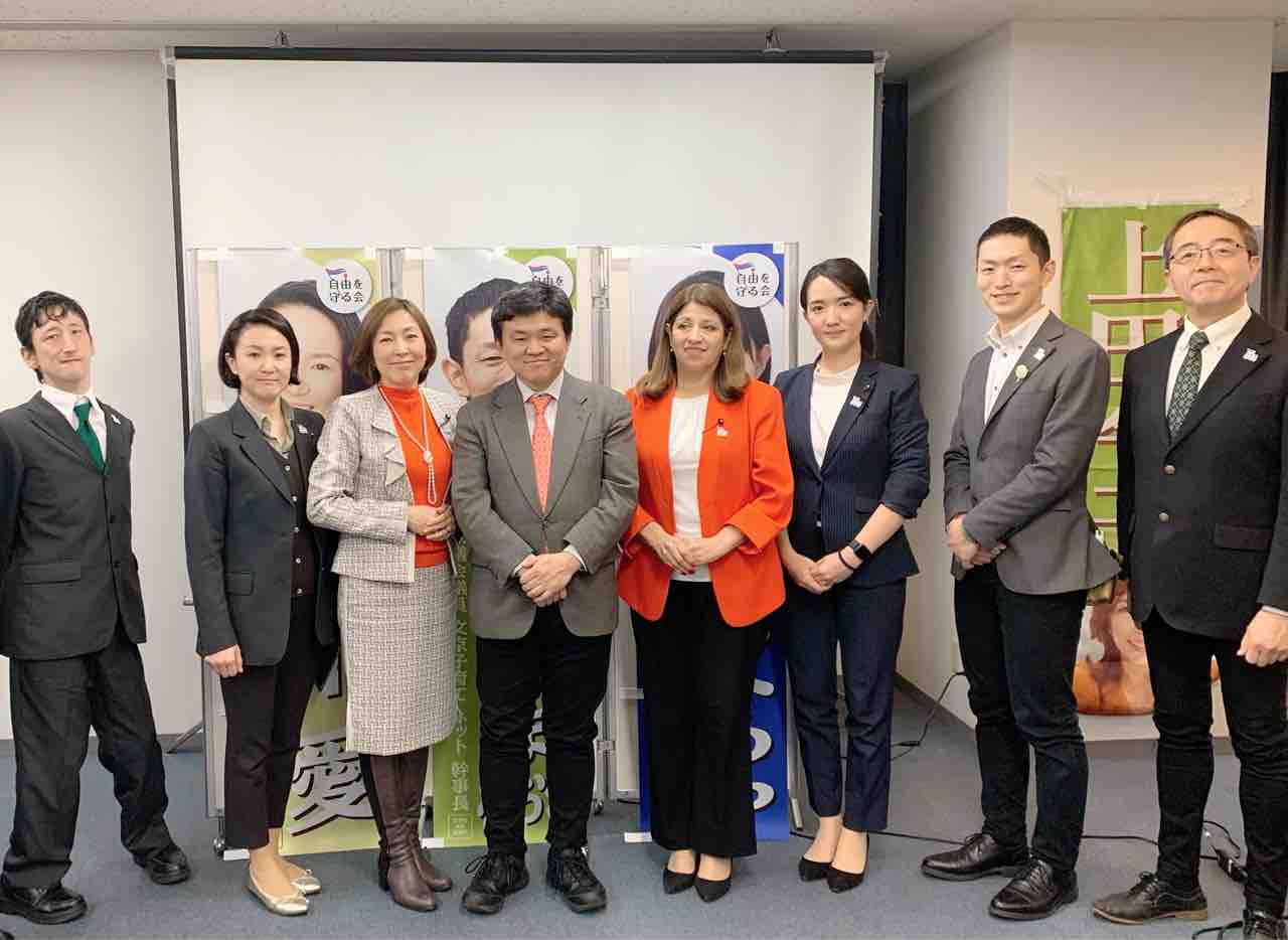 ▲左から高木章成幹事、白川愛目黒区議、お姐、松本たけひろ埼玉県和光市長(自由を守る会顧問)、井上ノエミ墨田区議、さんのへあや江東区議、高浜なおき文京区議、渡辺大三小金井市議