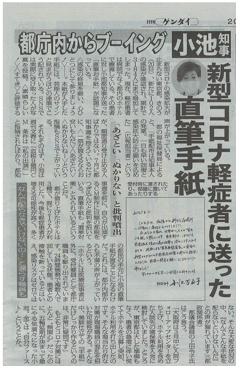 小池知事がコロナ軽症患者に直筆手紙 選挙対策と批判噴出 日刊ゲンダイ