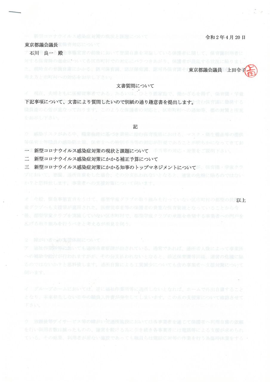 上田令子去る4月14日に「令和2年4月新型コロナウイルス感染症対策補正予算等審査特別委員会」(以下コロナ予算特別委)における本会議「緊急質問通告書」を提出していたのは既報の通りです。 ▲通告書 本会議における「緊急質問通告書」は石川良一議長(都民ファーストの会)により...