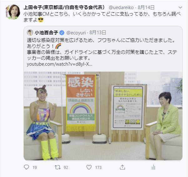 お姐が内訳を担当部局に確認したのが8月17日でした。一方お姐Twitterは小池知事の「不要不急」の巨額CMや広告費について問題視をする方々で盛り上がっておりました。