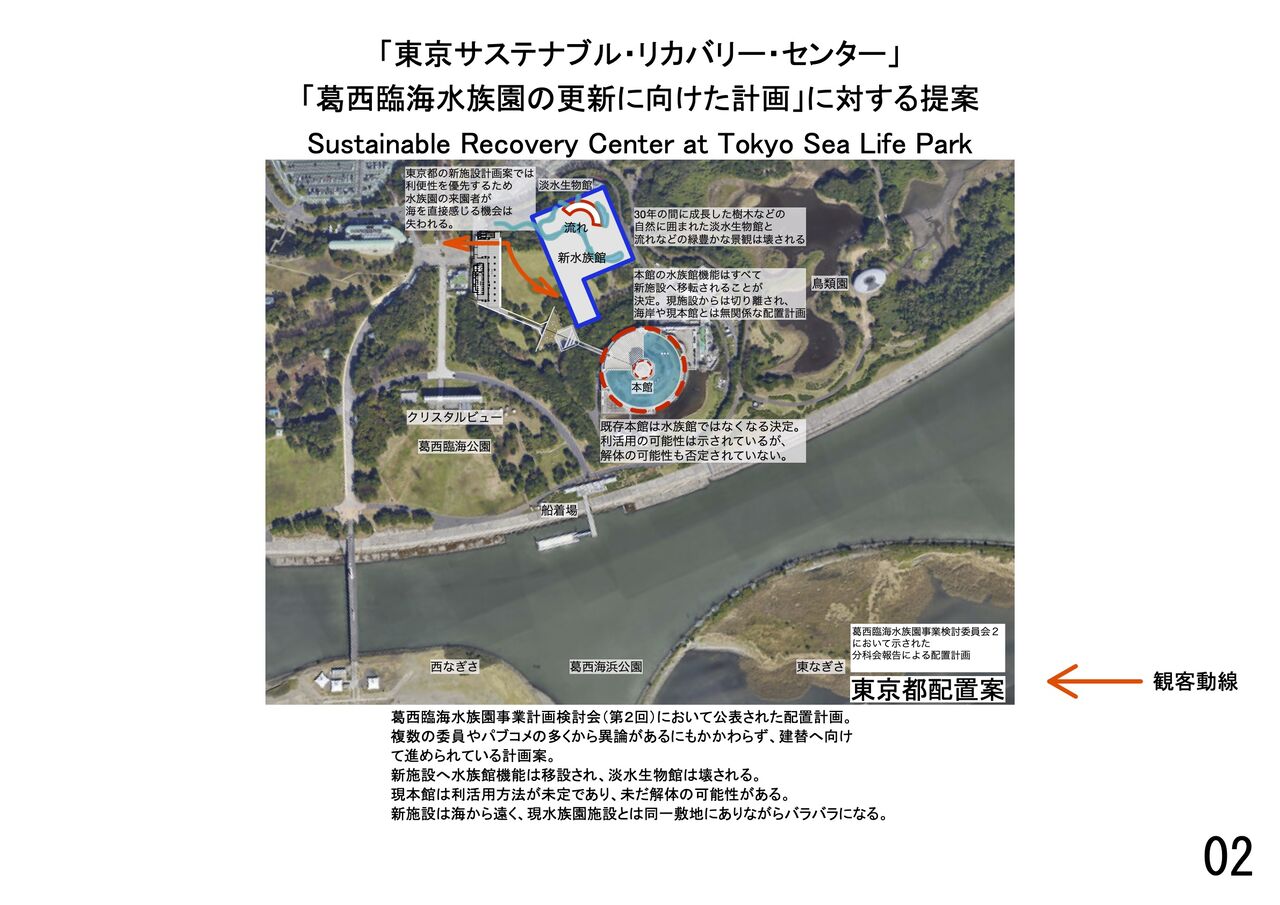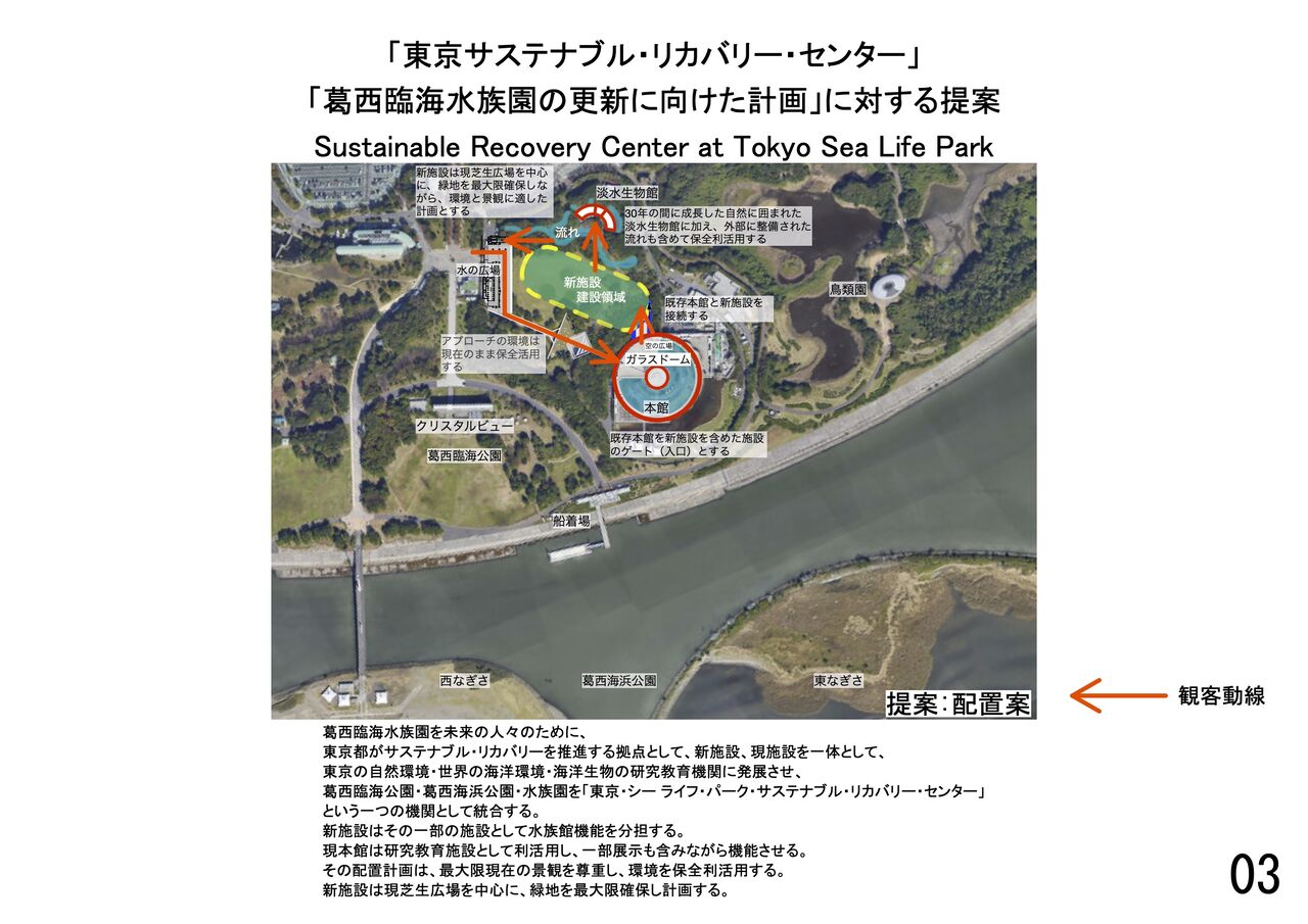 サステナブル・リカバリーを推進する拠点として、葛西臨海水族園の新施設、既存施設を一つのものとして、東京の自然環境・世界の海洋環境・海洋生物の研究教育機関に発展させ、葛西臨海公園・葛西海浜公園・葛西臨海水族園を統合する「東京サステナブル・リカバリー・センター」という一つの機関とすることは、都の環境政策につながるものであり、水族園の本来の在り方と持続可能な未来社会を提示している。