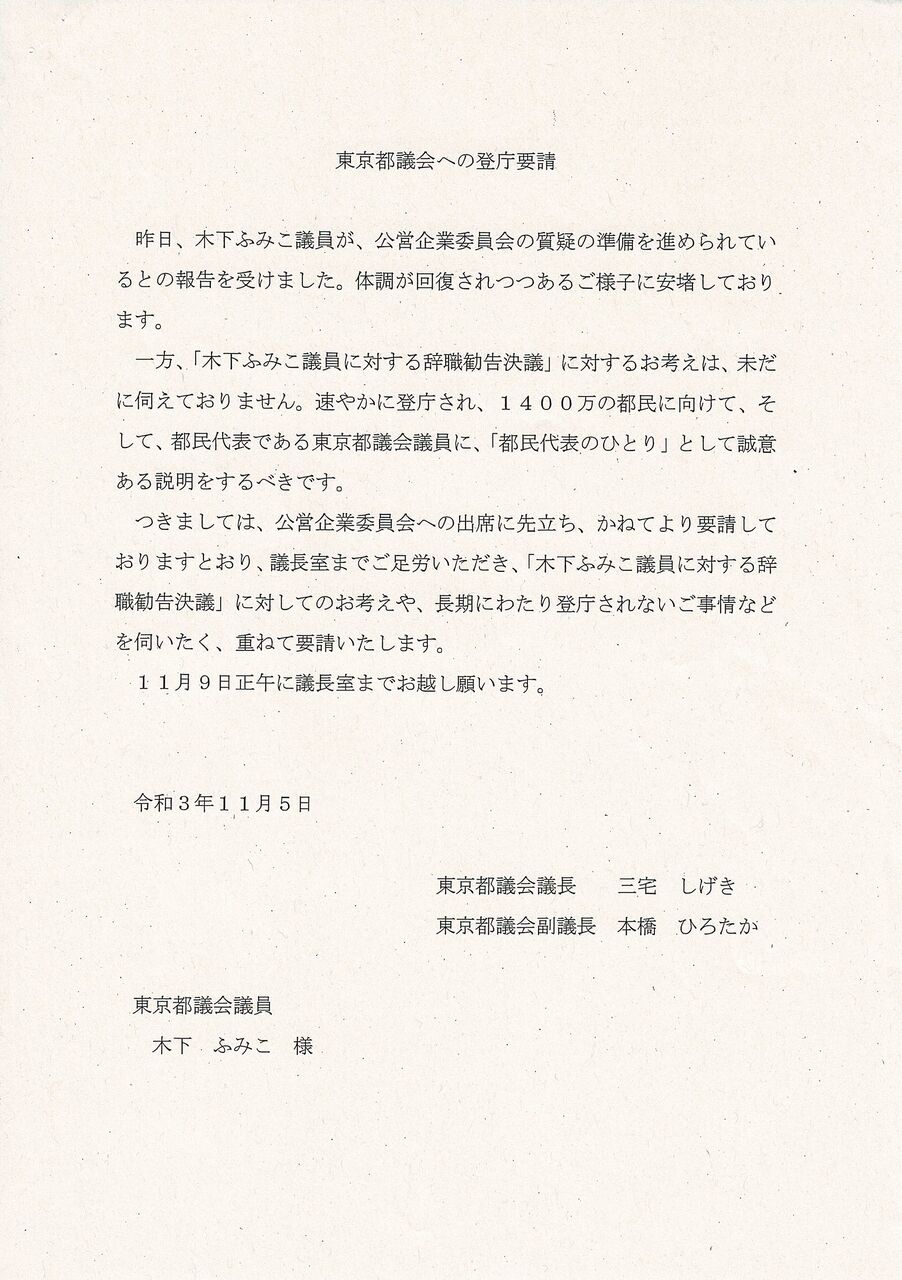 「令和3年8月19日都議会第二回臨時会にて私は、非違行為を犯した木下ふみこ都議の応援、抜てきをした政治責任と説明責任につき、知事の所見を確認したところ「お話の都議の事案についてでございますが、起こした本人がしかるべき対処すべきもの、このように考えます。」と、まったく都民への説明責任も果たさず、政治責任も放棄する無責任な答弁をされました。令和3年9月17日知事定例会見で記者に