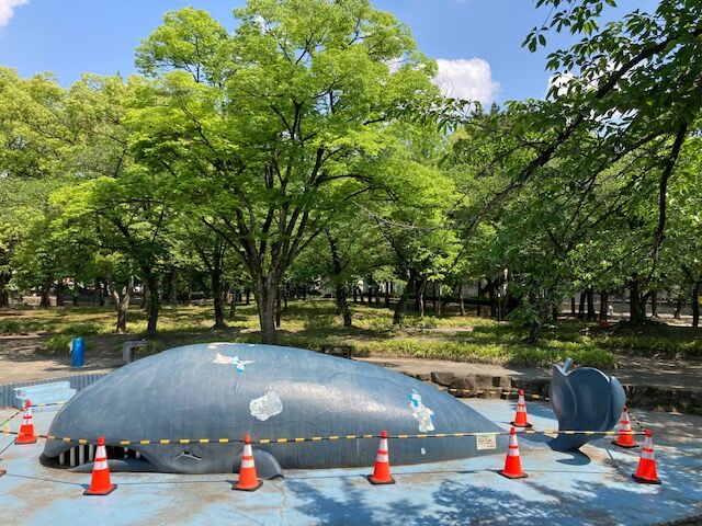 くじら像は登録有形文化財のため、公園を所管する土木事務所単独で補修を進めることはできず、今後、名古屋市教育委員会文化財保護室や文化庁との協議が必要になる。まずは現状についての届け出を文化庁に提出したのち、これ以上剥離が進まないようくじら像に仮囲いを設置。詳細な調査を実施したうえで、補修のための申請を文化庁に提出する予定。