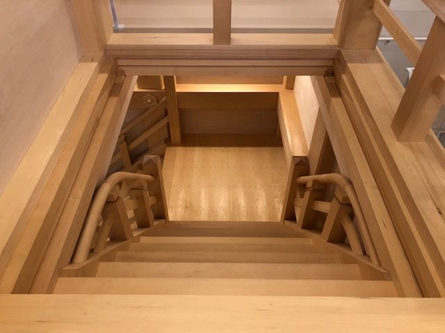 10月31日午後の視察では、新木造天守の1階から2階までの復元された階段を実際にのぼってみたが、想像していたほど急ではないように感じた。ただ、高齢者や子どもなど転落の危険は十分予見される。階段昇降部は、幅員140~160㎝程度、厚み75㎜の頑丈な階段で構成され、一層から二層まで上がるまでに階段が17段あり、中間の踊り場までの勾配は41度、踊り場から上が47度ある。なお、建設費は9,040万円。