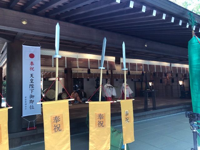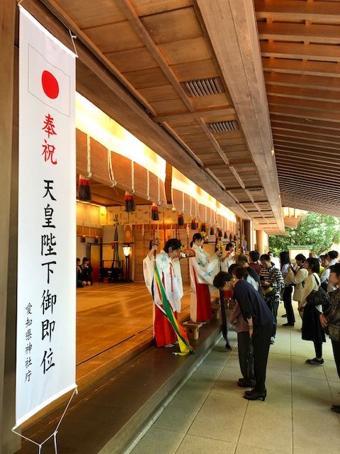 「天皇陛下御即位記念 奉納熱田神楽」がおこなわれた5月4日、ヨコイも地域の方々とともに奉納行事に参加した。会場は熱田神宮神楽殿だったが、天皇陛下御即位の時期と重なったため、熱田神宮への人出が半端ない。その影響を受け、「奉納熱田神楽」も空前の拝観者となった。