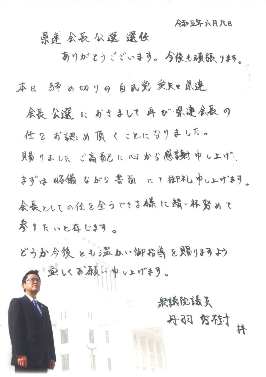 丹羽氏の任期は2年。来るべき衆議院解散総選挙や2年後の参院選における対応が急務とされる中、会長の強いリーダーシップが期待される。■ 丹羽秀樹会長挨拶具連会長公選選任ありがとうございます。今後も頑張ります。本日締め切りの自民党愛知県連会長公選におきまして、再び県連会長の任をお認め頂くことになりました。賜りましたご高配に心から感謝中し上げ、まずは略儀ながら書面にて御礼申し上げます。会長としての任を全うできる様に精一杯努めて参りたいと存じます。どうか今後とも温かい御指導を賜りますよう宜しくお願い申い上げます。衆議院議員 丹羽秀樹