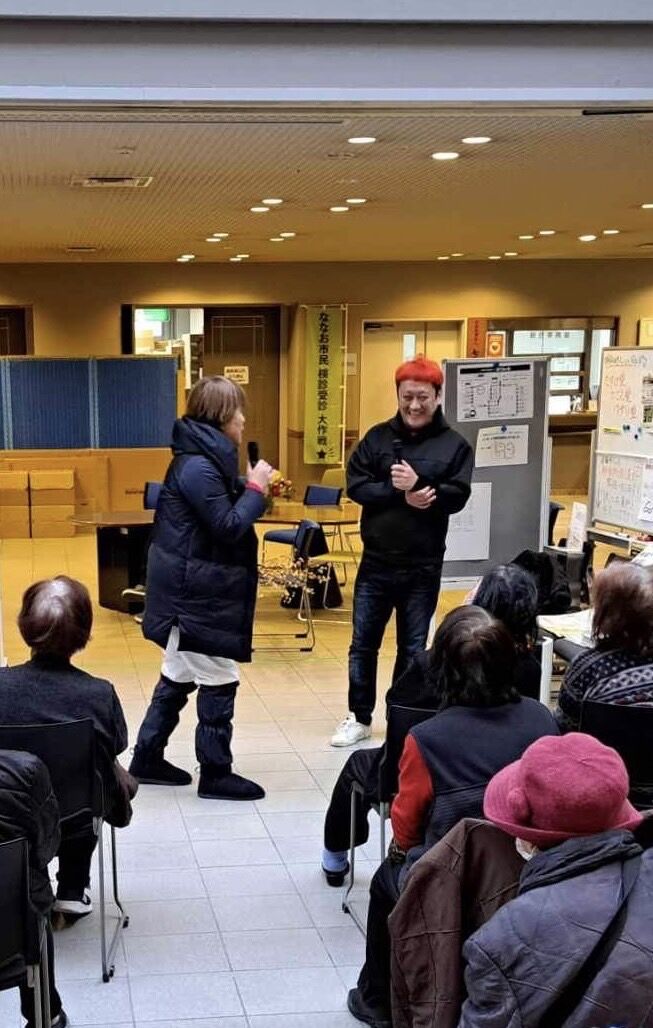 IMG_1377横井利明から名古屋市防災危機管理局に相談したところ、名古屋市が支援している石川県七尾市に相談。話はとんとん拍子で進み、名古屋市から派遣(ボランティア)される形で、避難場所でのお笑いライブを始めた。小宮さんは当初、「被災者にお笑いを提供することは失礼にあたらないだろうか。」と悩んだ時期もあったというが、現地でのライブは各地の公民館から引っ張りだこの状態が続き、被災地のテレビでも放映されている。2月2日からはNHKが小宮さんの活躍の様子の撮影依頼があったという。