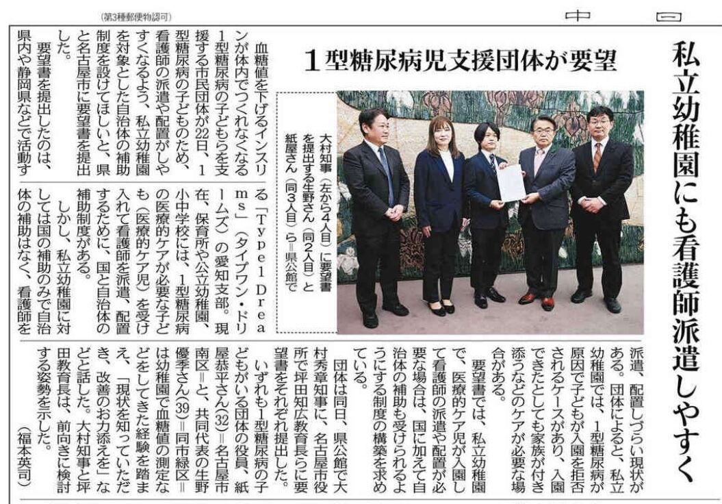 そして4月22日、T1Dの生野優季共同代表、紙屋恭平さん、自民党愛知県議団の川嶋太郎団長とともに、愛知県公館を訪れ、大村知事に直接要請させていただいた。知事とは数回にわたり私立幼稚園に医ケア児が通園する場合の支援の在り方について調整を行っていたこともあり、「県議会や市議会ともよく相談し、1日も早く実現できるよう検討したい。」また、坪田名古屋市教育長、佐藤名古屋市子ども青少年局長からも、「愛知県と連携して実現したい。」との前向きな回答をいただいた。