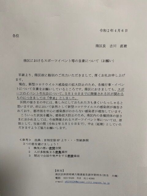 南区では区内にお住いの皆様が主催する各種行事やスポーツイベントの自粛期間を5月10日まで延長することを決め、4月6日付、南区長名により各方面に対し通知を出した。通知の中で古川直樹南区長は、「市において依然として新型コロナウイルスの感染例が増加しており、都市部を中心に感染源がわからない感染者が増加している」と理由を示している。