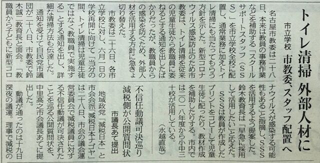 5月28日におこなわれた自民党市議団総会でも教職員によるトイレ清掃は、結果として子どもたちへの感染リスクが否定できず保護者等の理解は得られないとして問題となった。その後、ヨコイも中心となり、市教委と解決策に向けて議論を重ねた結果、5月27日に閣議決定されたばかりの新型コロナウイルスの感染拡大を受けた令和2年度第2次補正予算案の中にある「スクールサポートスタッフ」制度の拡大予算を活用し、国の補助を仰ぎながら、小中学校トイレ清掃を外部により実施する方向で検討することになった。今後、国や市財政局とも協議を重ね、できる限り早い段階で教職員清掃から外部清掃に切り替えたいと考えている。(左写真 5月29日中日新聞朝刊)