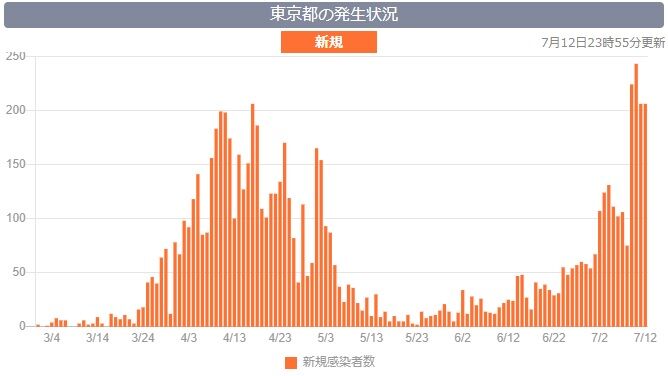 一方、東京都内では、陽性者が4日連続で200人を超え、この1週間の合計では1162人と感染拡大に歯止めがかからない状態。夜の街が中心とはいえ、陽性率も高止まりしており、感染第2波が懸念されている。また、7月12日における新規感染者数も埼玉県31人、千葉県31人、神奈川県23人と東京都を中心に感染が拡大している状況だ。