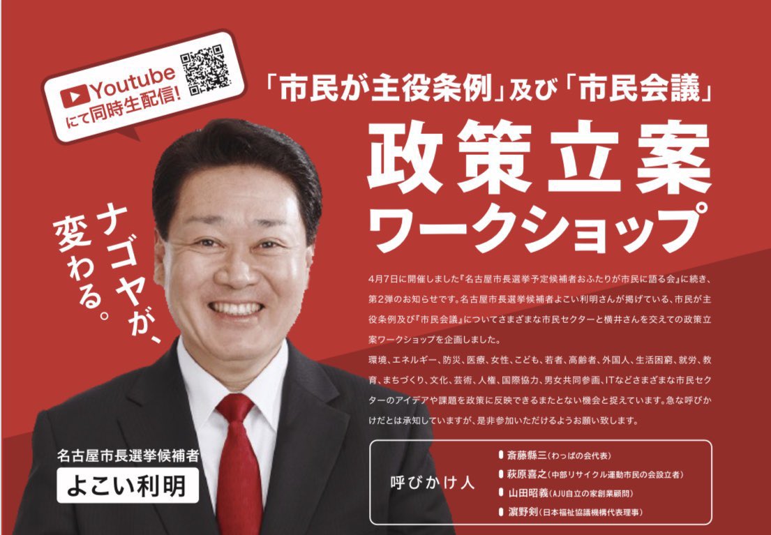 横井利明横井利明がマニフェストに掲げる「市民が主役条例」及び「市民会議」について、さまざまな市民セクターの皆様との政策立案ワークショップが4月17日(土)午後7時から開催された。環境、エネルギー、防災、医療、女性、こども、若者、高齢者、外国人、生活困窮、就労、教育、ま...
