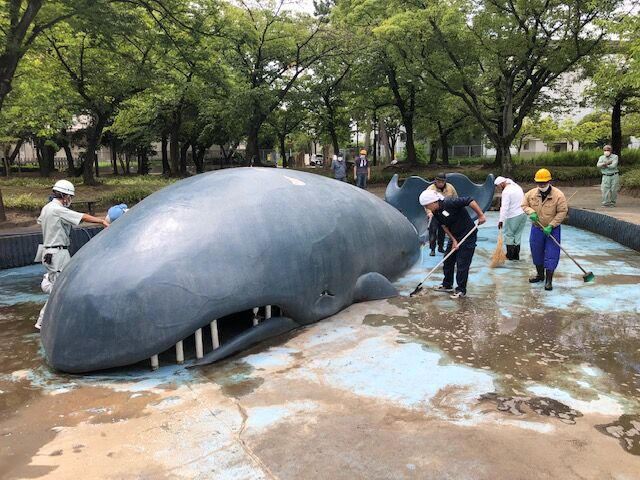 くじらの清掃 横井利明国の文化審議会から登録有形文化財の登録について文部科学大臣に答申に答申された道徳公園の「くじら」の清掃が、7月16日(金)、南土木事務所によっておこなわれた。くじら池の中は経年劣化により、汚れやひび割れでかなり痛んでいたが、清掃や高圧洗浄等によりかなりきれいな...TwitterFacebookはてブLINE2021.08.08国の文化審議会から登録有形文化財の登録について文部科学大臣に答申に答申された道徳公園の「くじら」の清掃が、7月16日(金)、南土木事務所によっておこなわれた。くじら池の中は経年劣化により、汚れやひび割れでかなり痛んでいたが、清掃や高圧洗浄等によりかなりきれいな状態に。また、ひび割れた個所も今後修繕する。この夏には、くじら池に水を張り、築造当時の姿に戻したうえで、子どもたちの水遊びの場として1日だけ復活する予定だ。